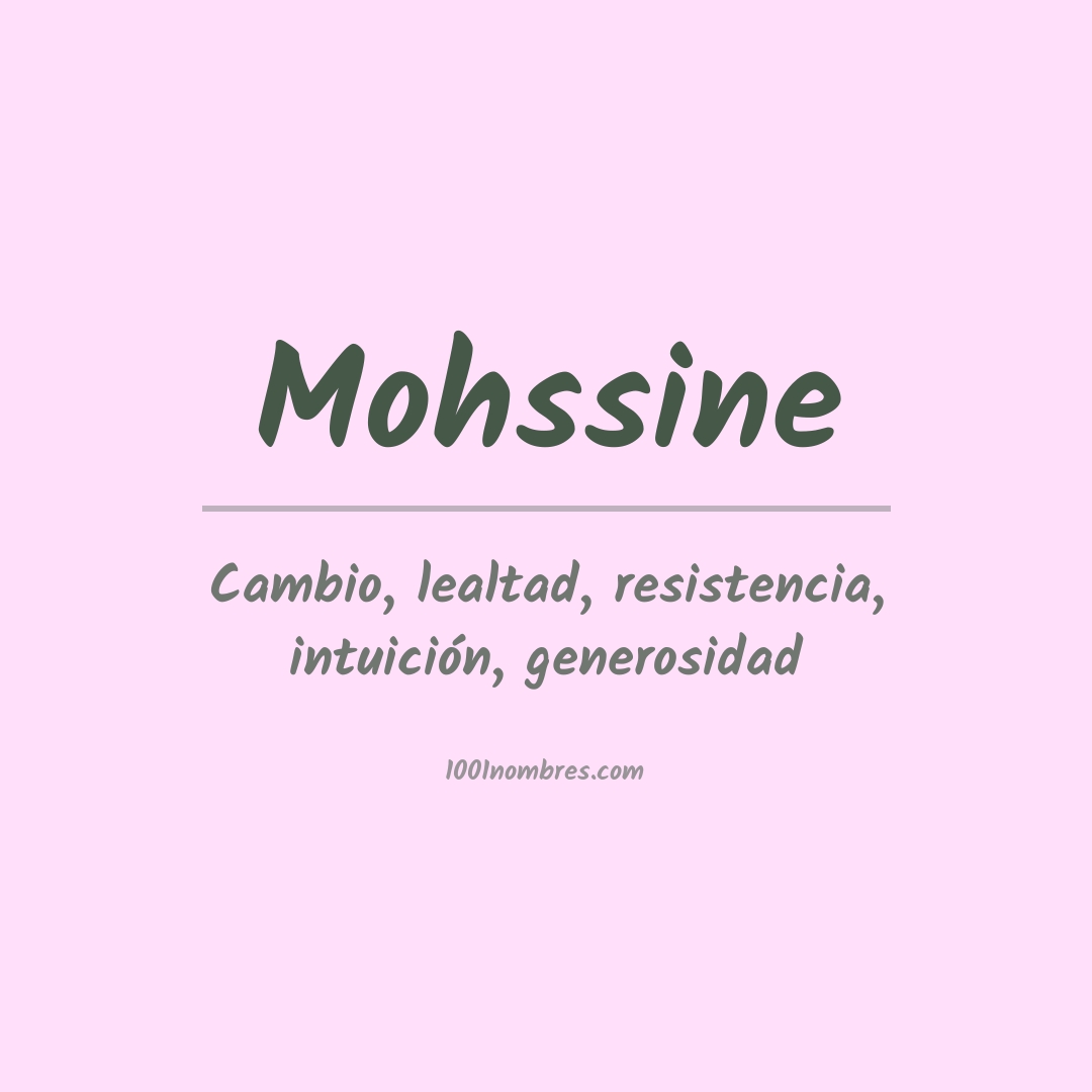 Mohssine mohssine significa "fiel". Es un nombre derivado del árabe que se usa principalmente como nombre masculino. Se cree que el nombre representa la lealtad, la confianza y la honradez.